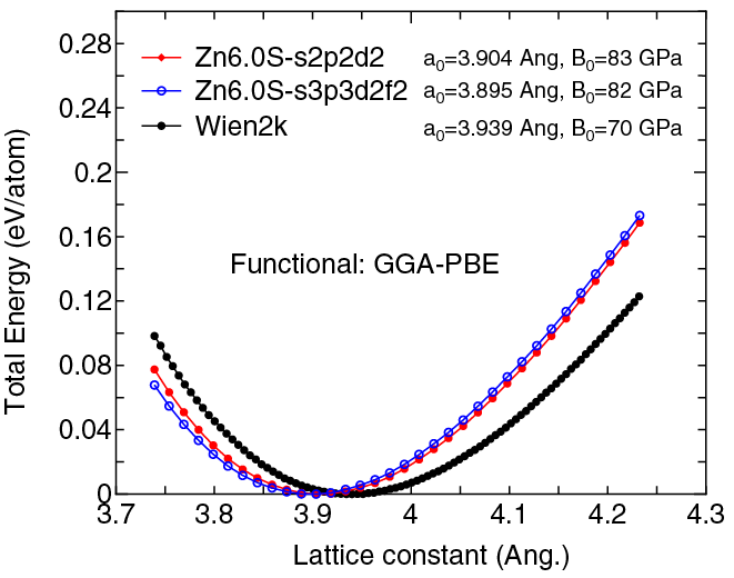 the Murnaghan equation of state. The difference between Zn6.0S-s2p2d2 and Zn6.0S-s3p3d3f1