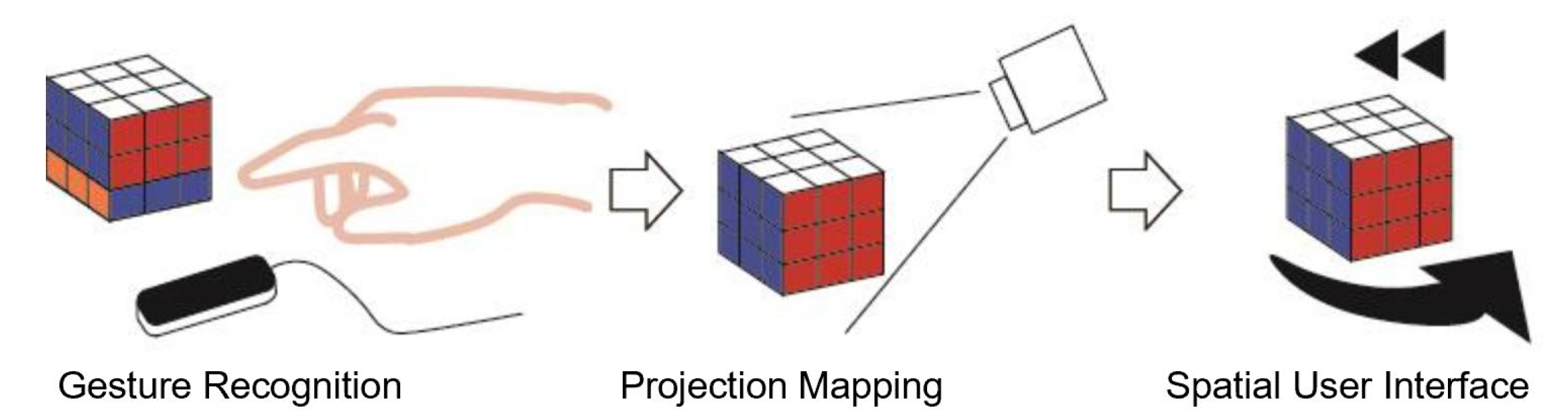 a spatial user interface by projection mapping of virtual Rubik's cube onto a display cube. The user can play the