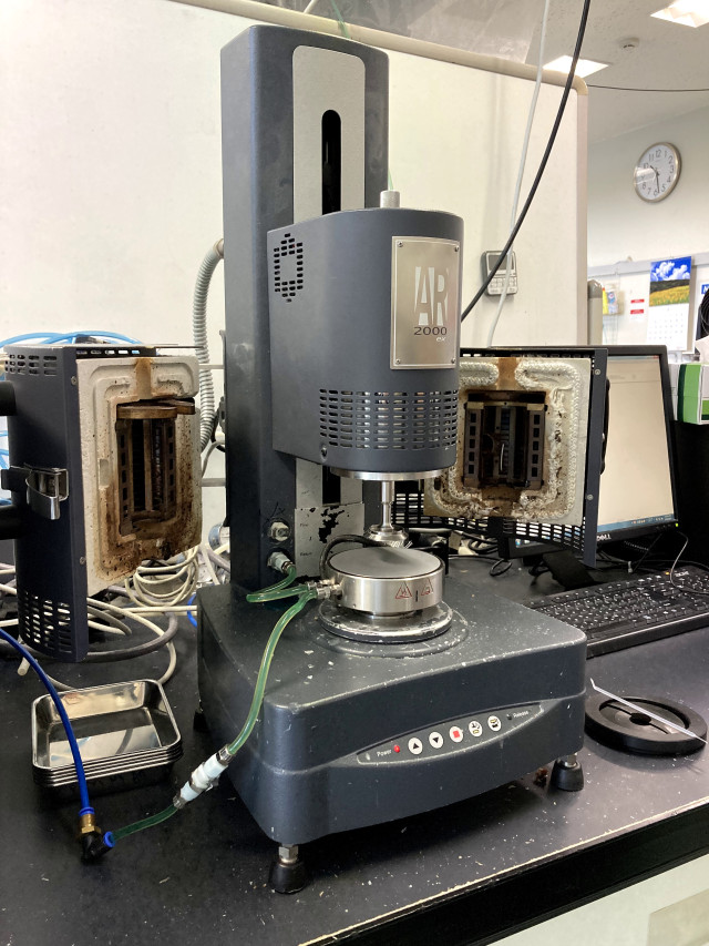 山口政之研: 先日、松村研究室の田岡君が当研究室の #レオメーター を使いに来てくれました。年季の入った装置ですが、頑張れば水の粘度も測定できる優れものです。