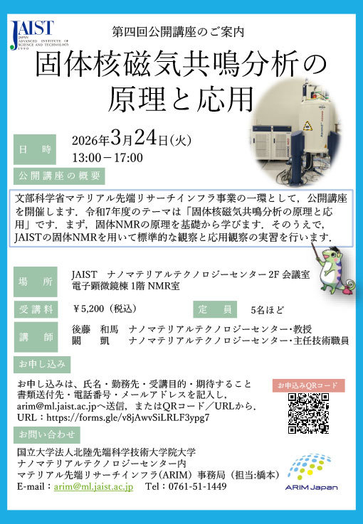 文部科学省マテリアル先端リサーチインフラ(ARIM)第4回公開講座「固体核磁気共鳴分析の原理と応用」