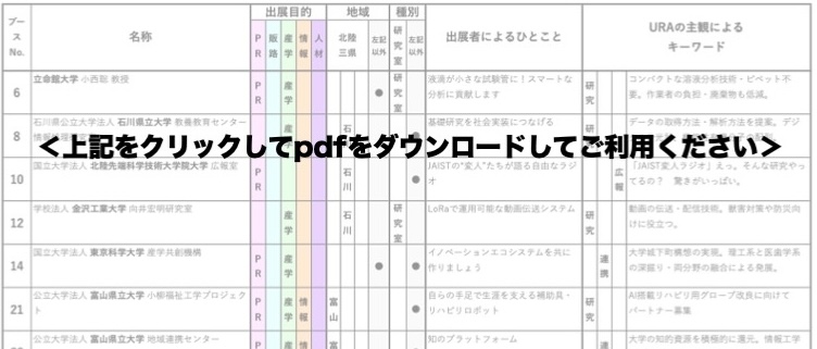 一覧表は出展ブース番号順に整理してあります。「産学連携」を目的の一つとした出展が95%超とほとんどですので、連携を考えていらっしゃる方はには心強いですね。出展者の地域も北陸三県とそれ以外で分類してあります。地域に着目したマッチングに活用できると思います。『学』に関しては北陸三県以外からの出展が4割を超えており、全国的な『学』のネットワークが構築されていることがわかります。皆様もこの『学』のネットワークと連携してください、そして一緒にネットワークを強化しましょう。